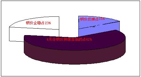 廠家市場調研情況來看,如下圖所示:對于4月鋼材行情都持不懂看法,其中認為“鋼價能有小幅反彈”的占15%,“鋼價會延續下跌”的占62%,“鐵價逐漸企穩”的占23%。由此可見,過半數廠家對后市預期仍較悲觀,而且3月之前鋼價的反彈并沒有給廠家帶來多大的信心,繼續看跌的商家較4月初有所增加,最近鋼材市場有降價走勢,漲缺乏實質性需求支撐,動力不足,而受低庫存及高成本支撐,下跌難有空間。短期來看,熱軋價格就這么弱勢維持。